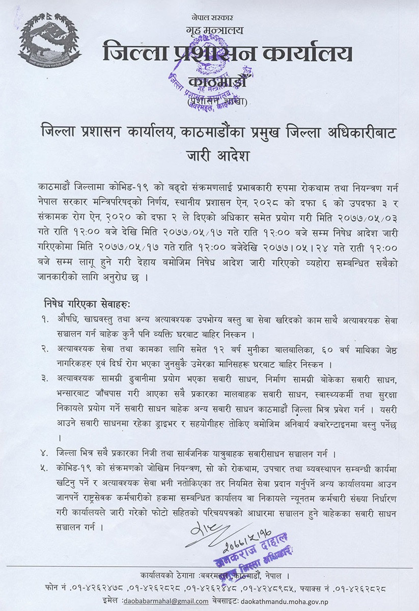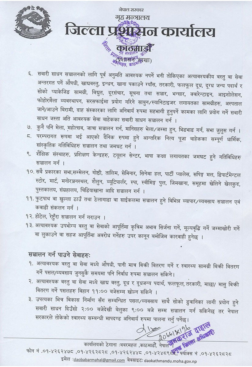 उनका अनुसार निषेधाज्ञा २४ गते राति १२ बजेसम्म कायम रहन्छ। बुधबार काठमाडौं, भक्तपुर र ललितपुर जिल्लाका प्रमुख जिल्ला अधिकारीहरूको बैठकले यस्तो निर्णय गरेको हो। प्रजिअ दाहालका अनुसार यसपालि अत्यावश्यक वस्तु तथा सेवालाई खुकुलो पारिएको छ।
