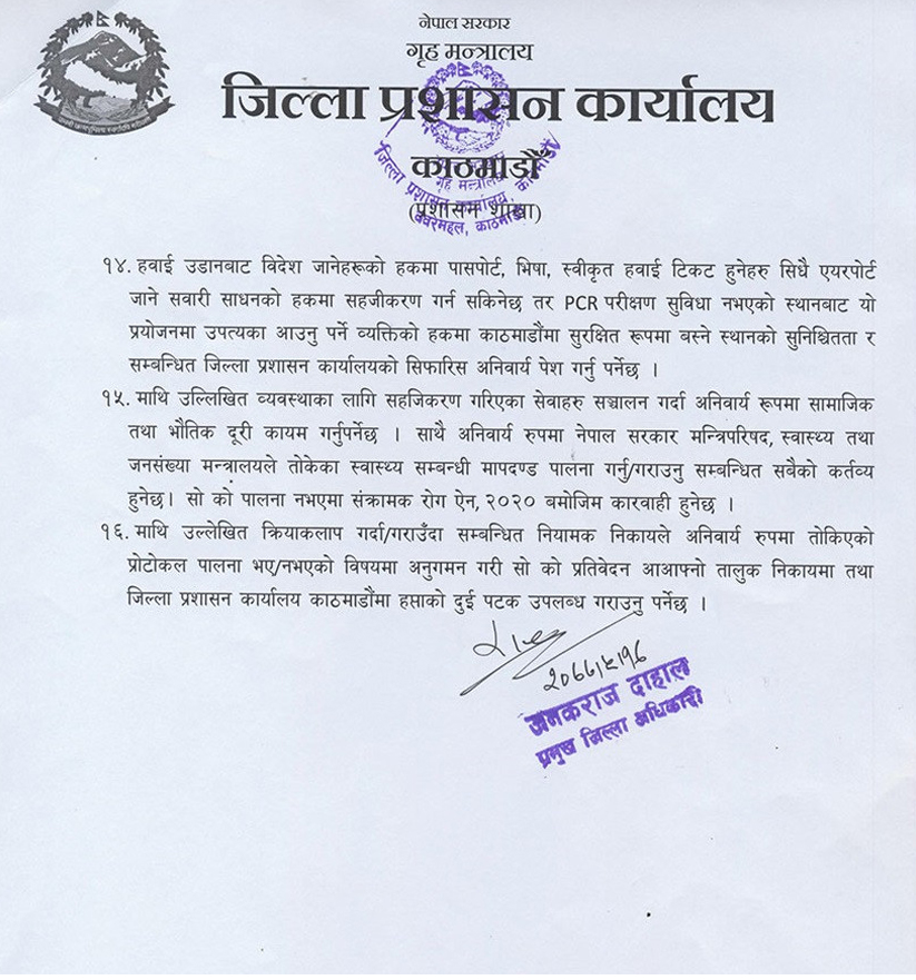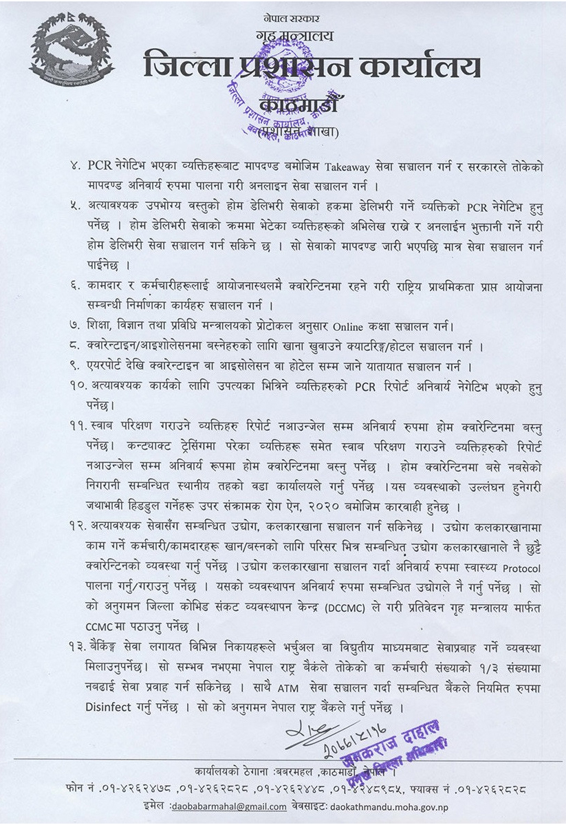 स्वाब दिनेहरूलाई घरमै निगरानीमा राखिने दाहालले बताए। काठमाडौं उपत्यकामा कोरोना संक्रमण नघटेपछि जारी निषेधाज्ञालाई निरन्तरता दिनुपरेको दाहालले बताए। यसअघि सरोकारवाला सबै पक्षसँग छलफल गरेर प्रशासनले गृह मन्त्रालयमा निषेधाज्ञासम्बन्धी राय पठाएको थियो। गृहले राय अनुमोदन गरेपछि तीन वटै जिल्लाका प्रमुख जिल्ला अधिकारी निषेधाज्ञा निर्णयमा सामेल भएका थिए।