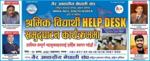 गैर आवासीय नेपाली संघ, राष्ट्रिय समन्वय परिषद् (NRNA-NCC) दक्षिण कोरियाले आजदेखि नेपाली श्रमिक तथा विद्यार्थीहरूको समस्या समाधान र सहजताका लागि पहिलोपटक औपचारिक रूपमा HELP DESK सञ्चालनमा ल्याएको छ। राजधानी सउलको दोङदेमुनमा आयोजित भव्य उद्घाटन समारोहमा नेपाल सरकारका श्रम, रोजगार तथा सामाजिक सुरक्षा मन्त्री शरदसिंह भण्डारी प्रमुख अतिथि रहने भएका छन्।