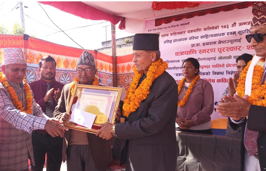 प्रतिष्ठानले भक्तपुर सूर्यविनायक–५, कटुञ्जेस्थित चक्रपाणि समारकस्थलमा आयोजना गरेको जन्मजयन्ती एवं सम्मान कार्यक्रममा प्रा डा दयाराम श्रेष्ठलाई रु २० हजारसहितको चक्रपाणि स्मरण पुरस्कार–२०८२ बाट सम्मान गरिएको छ ।