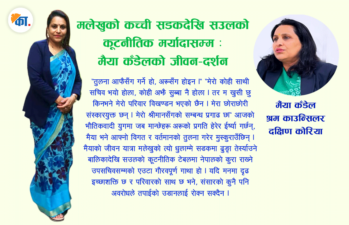 नेपाल र दक्षिण कोरियाबीचको कूटनीतिक सम्बन्ध र हजारौँ नेपाली श्रमिकहरूको समस्यासँग साक्षात्कार गर्दै कूटनीतिक मर्यादामा रहेर सेवा पुर्याउने व्यक्तित्वहरूको भूमिका निकै अर्थपूर्ण रहने गर्छ । यही परिवेशमा नेपाल सरकारको उपसचिव, दक्षिण कोरियाका लागि श्रम काउन्सिलरको जिम्मेवारी सफलतापूर्वक निर्वाह गरिरहनु भएकी मैया कँडेलको जीवन यात्रा निकै प्रेरक छ । कुनै बेला धादिङको मलेखुमा गुड्ने ट्रकहरू रोक्न सडकमा ढुङ्गा र मुढा तेर्स्याएर ‘लिफ्ट’ माग्ने ती सानी बालिका आज आफ्नो संघर्ष, दृढ इच्छाशक्ति र पारिवारिक सद्भावका कारण एक सफल प्रशासक र कूटनीतिज्ञका रूपमा स्थापित हुनुहुन्छ । प्रस्तुत छ, कामदार दैनिकको विशेष स्तम्भ ‘उत्प्रेरणा’का लागि सन्तोष खड्काले उहाँसँग गरेको कुराकानीको सम्पादित अंश: