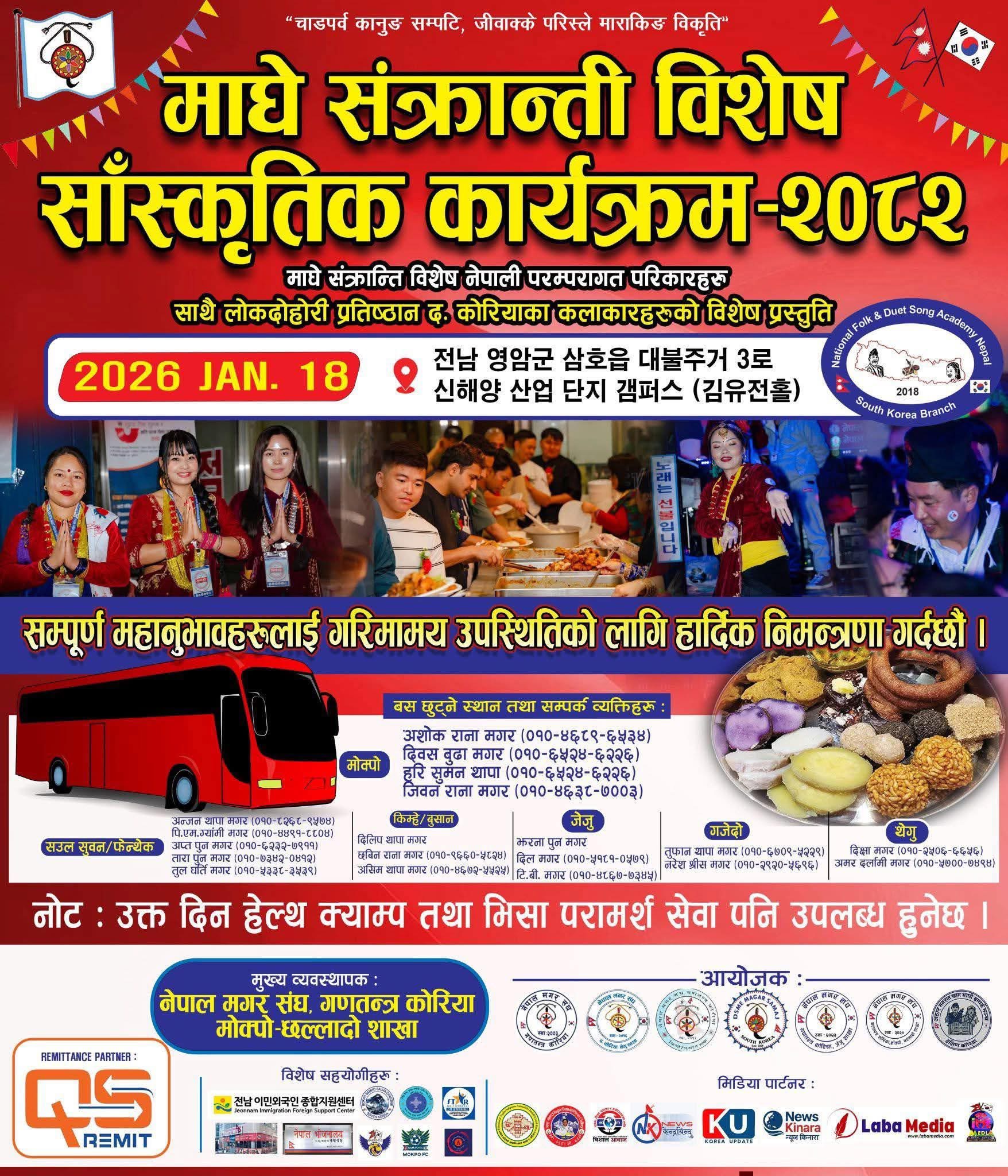 दक्षिण कोरियामा क्रियाशील विभिन्न मगर संघ–संस्थाहरूको संयुक्त आयोजनामा माघे संक्रान्ती पर्व–२०८२ को अवसरमा भव्य सांस्कृतिक कार्यक्रम आयोजना हुने भएको छ।