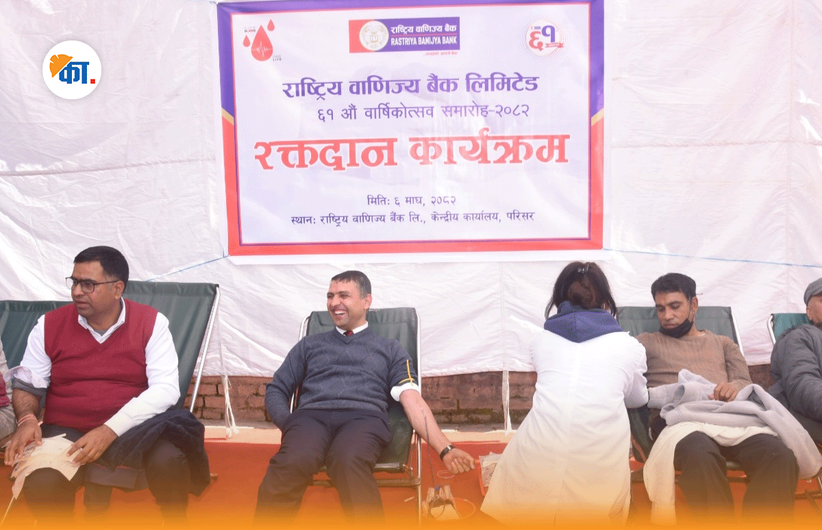 काठमाडौँ, ७ माघ / राष्ट्रिय वाणिज्य बैंकको ६१ औं वार्षिकोत्सवको अवसरमा रक्तदान कार्यक्रम सम्पन्न भएको छ । सो कार्यक्रममा ४१३ जनाले रक्तदान गरेका छन् ।