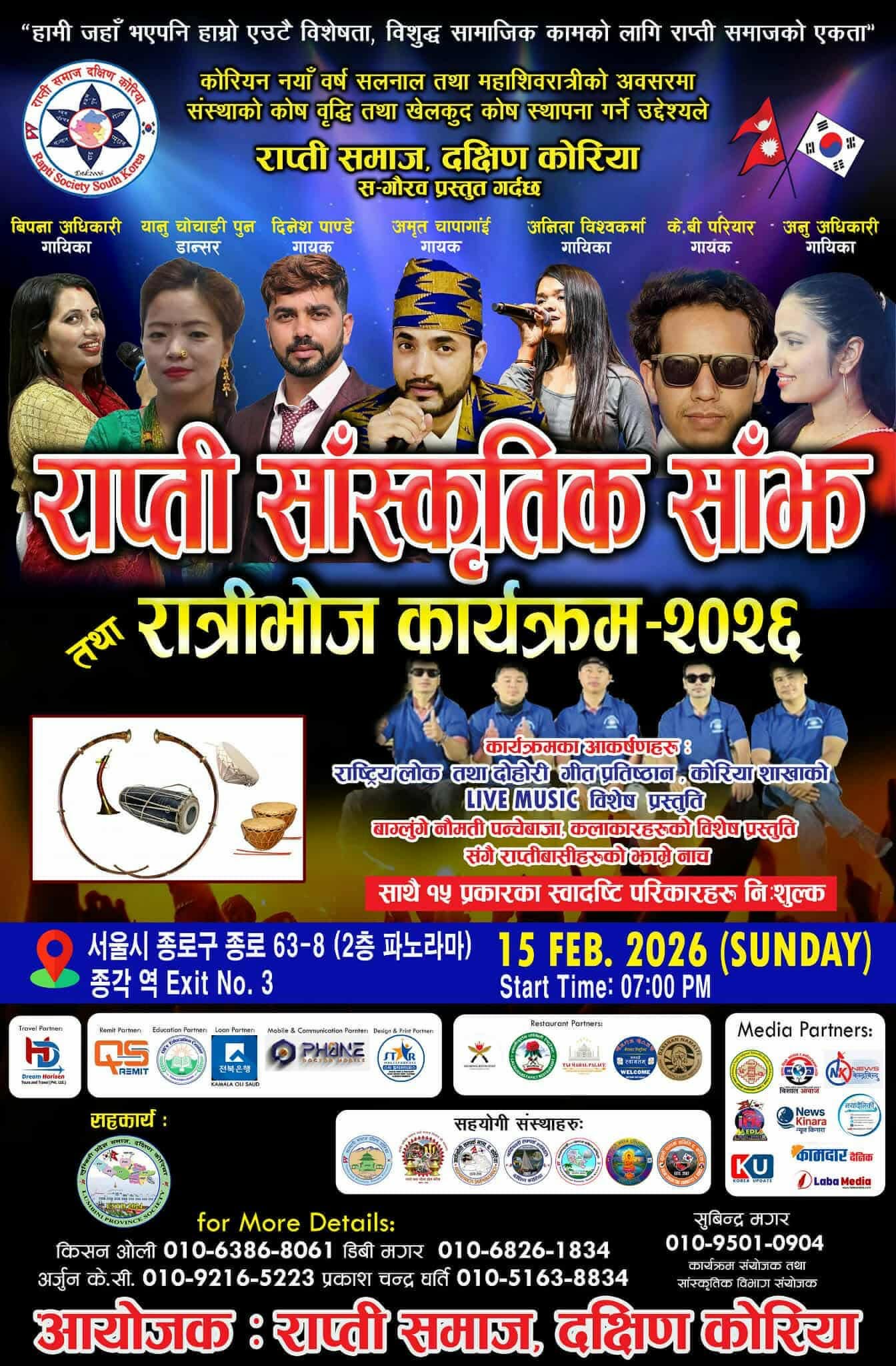 आयोजकका अनुसार कार्यक्रम फेब्रुअरी १५, २०२६ (आइतबार) साँझ ७:०० बजे सियोलस्थित (서울시 종로구 종로63-8 )종각 역 एक्जिट नं. ३ नजिक आयोजना हुनेछ।