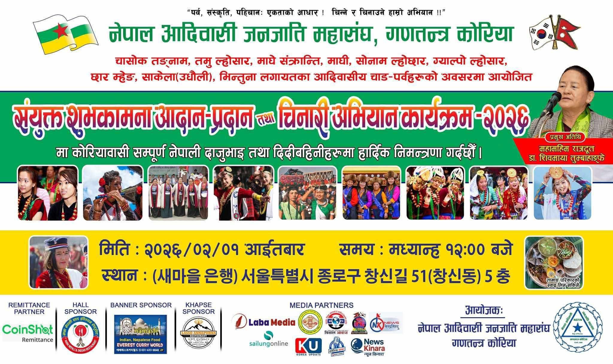 दक्षिण कोरियामा क्रियाशील नेपाल आदिवासी जनजाति महासंघ गणतन्त्र कोरियाको आयोजनामा आदिवासी समुदायको पर्व, संस्कृति र पहिचान प्रवर्द्धन गर्ने उद्देश्यसहित संयुक्त शुभकामना आदान–प्रदान तथा चिनारी अभियान कार्यक्रम–2026 आयोजना हुने भएको छ।