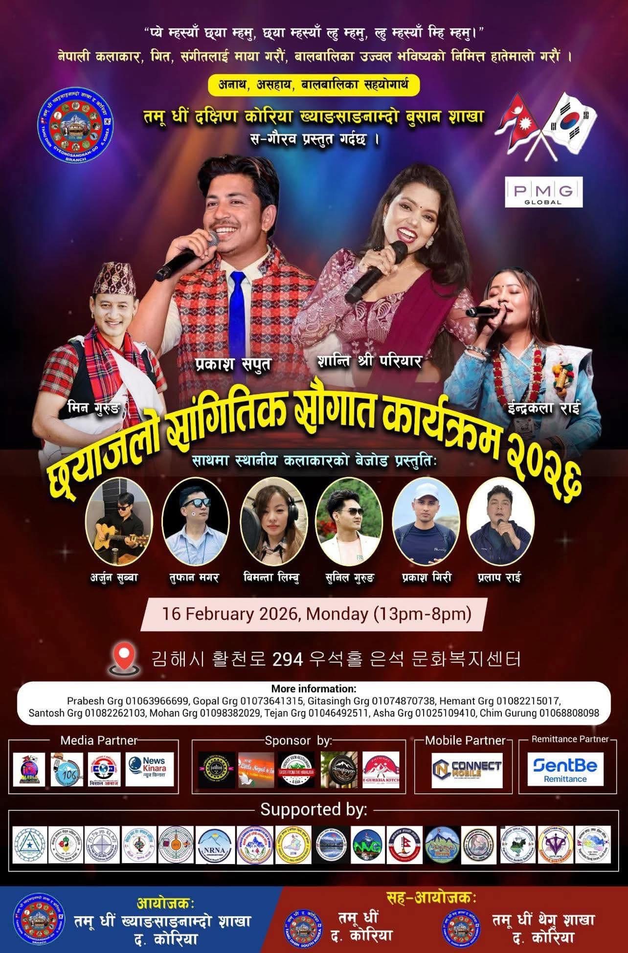 दक्षिण कोरियामा क्रियाशील स्याङ्जा समाज थेगु शाखाको आयोजनामा “अनाथ बालबालिका सहयोगार्थ” विशेष सांगीतिक कार्यक्रम ‘स्याङ्जा थेगु सांगीतिक धमाका–२०२६’ आयोजना हुने भएको छ। कोरियन नयाँ वर्ष सलनालको शुभ अवसर पारेर कार्यक्रम भव्य रूपमा आयोजना गर्न लागिएको आयोजकले जानकारी दिएको छ।