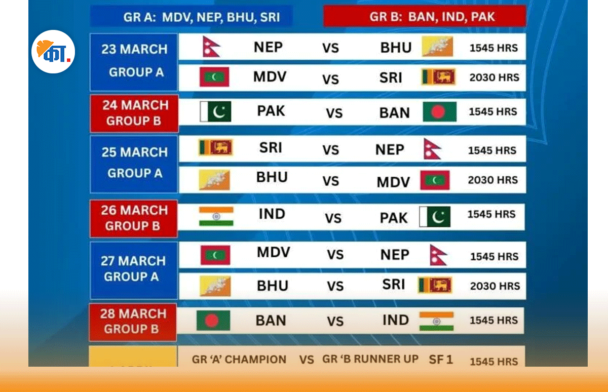 नेपालले आफ्नो उद्घाटन खेलमा भुटानको सामना गर्नेछ । यसैगरी नेपालले दोस्रो खेल मार्च २५ तारिखमा श्रीलङ्कासँग खेल्नेछ भने समूह चरणको अन्तिम खेल २७ मार्चमा माल्दिभ्ससँग हुनेछ ।
