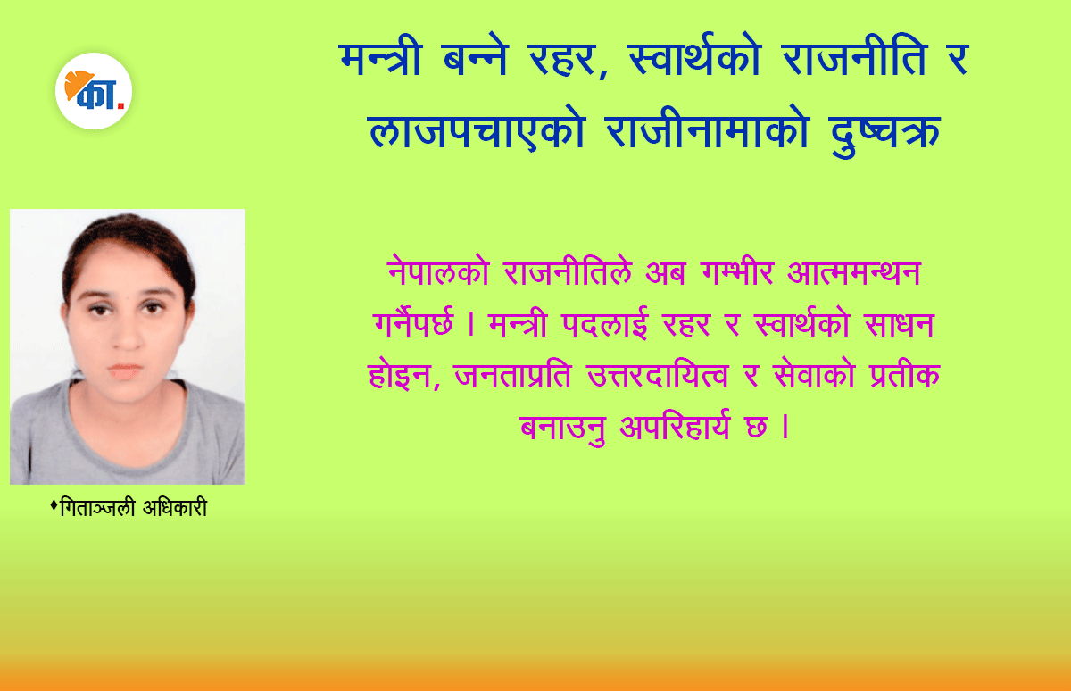 मन्त्री बन्ने रहर, स्वार्थको राजनीति र लाजपचाएको राजीनामाको दुष्चक्र २०८२ पुष २४, बिहीबार १२:०६२०८२ माघ १, बिहीबार १२:०१Leave a Comment on मन्त्री बन्ने रहर, स्वार्थको राजनीति र लाजपचाएको राजीनामाको दुष्चक्र