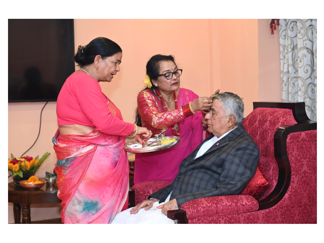 राष्ट्रपति पौडेलद्वारा बहिनीहरूबाट टीका ग्रहण कार्तिक १९, २०८१Leave a Comment on राष्ट्रपति पौडेलद्वारा बहिनीहरूबाट टीका ग्रहण